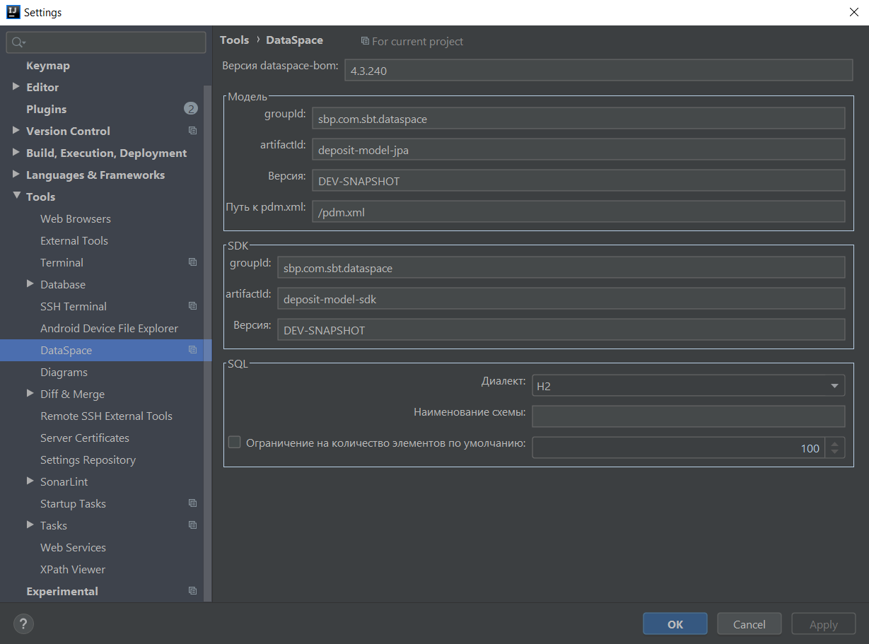 После подключения плагина станут доступны его настройки: File -> Settings -> Tools -> DataSpace.