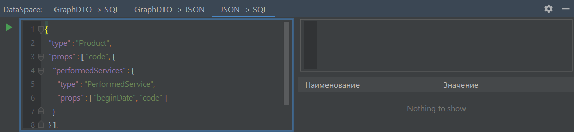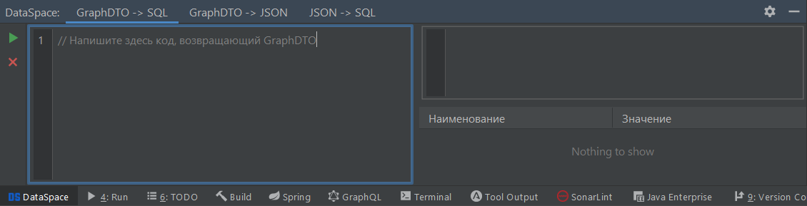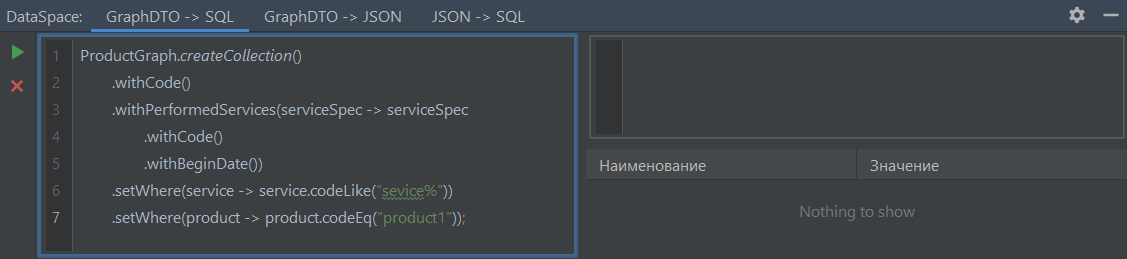 com.sbt.pprb.ac.graph.GraphJsonSerializable. При этом необязательно на последней строке писать ключевое словоreturn.Нажать кнопку Преобразовать GraphDTO в SQL (