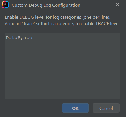 Для включения лог-записи плагина DataSpace необходимо открыть настройки Debug-логирования: Help -> Diagnostic Tools -> Debug Log Settings… и прописать в них строку "DataSpace".