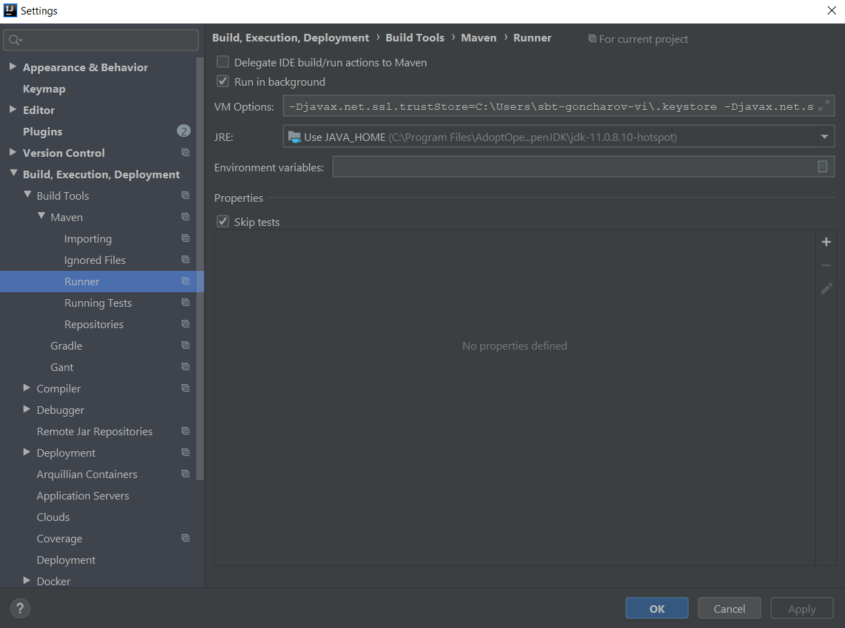 File -> Settings -> Build, Execution, Deployment -> Build Tools -> Maven -> Runner: