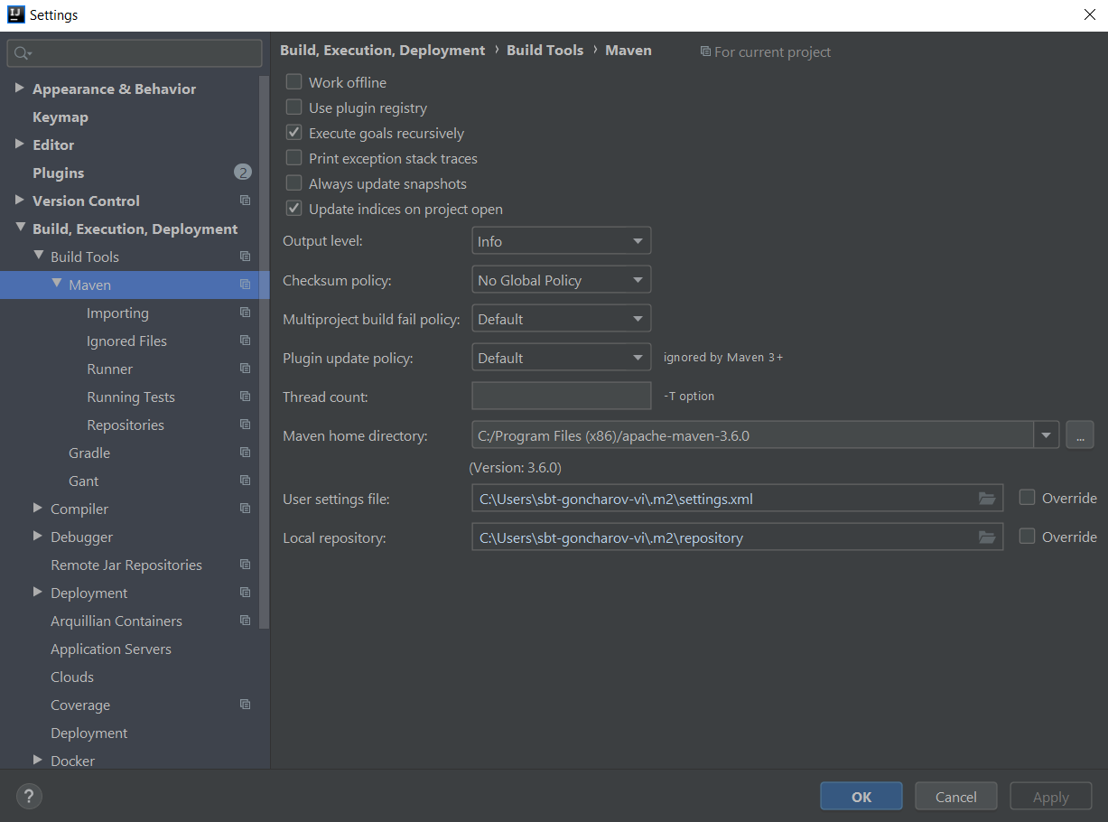 Плагин в процессе работы использует встроенный сборщик Maven для сбора необходимой информации, поэтому необходимо учитывать, что встроенный Maven использует настройки Maven для открытого проекта: