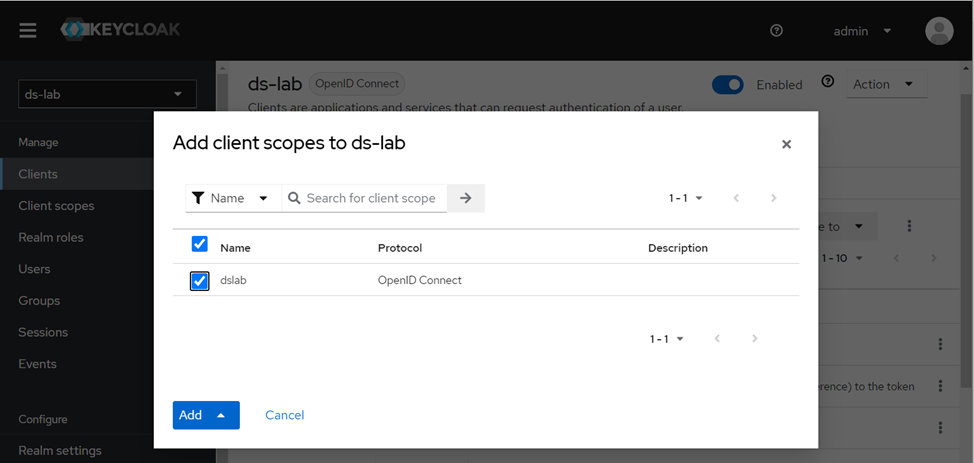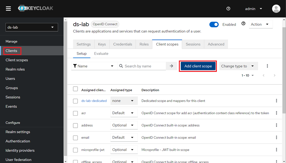 Перейти на страницу Clients, выбрать клиента "ds-lab". Перейти на вкладку Client scopes. Нажать Add client scope.