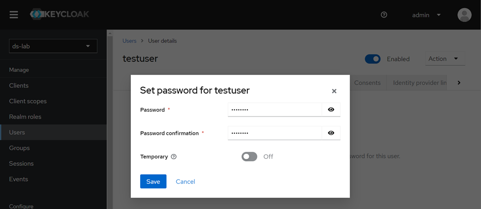 На вкладке Credentials задать пользователю пароль (временный или постоянный):