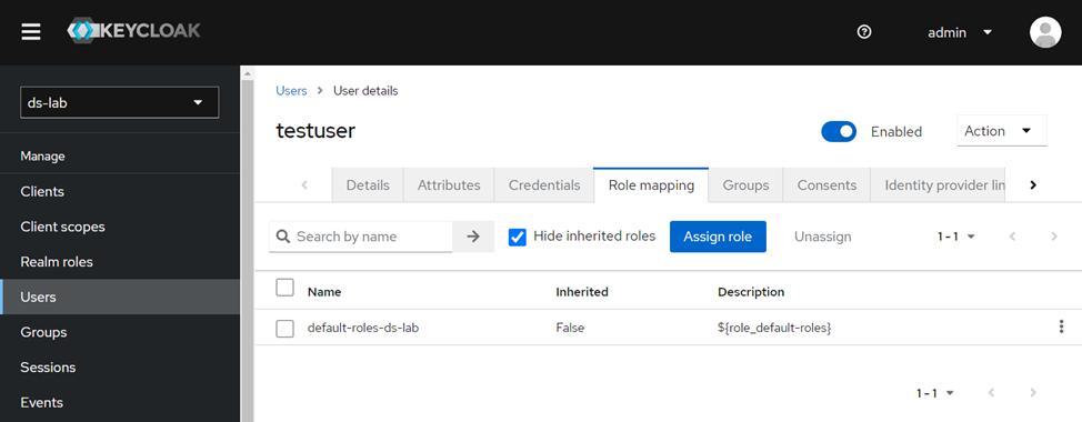 Перейти на страницу Users, открыть вкладку Role mappings и нажать Assign role.