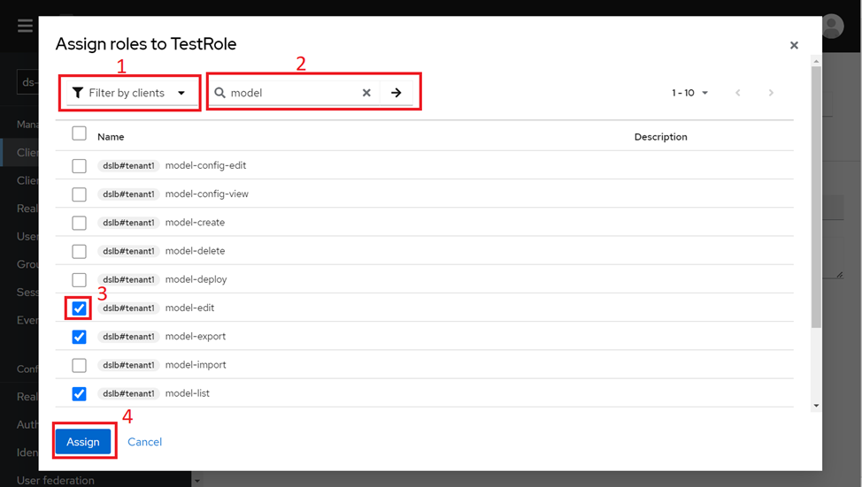 Во всплывающем окне необходимо переключить фильтр на фильтрацию по ролям клиентов, а не realm (на рисунке ниже — 1).