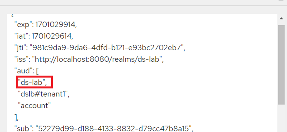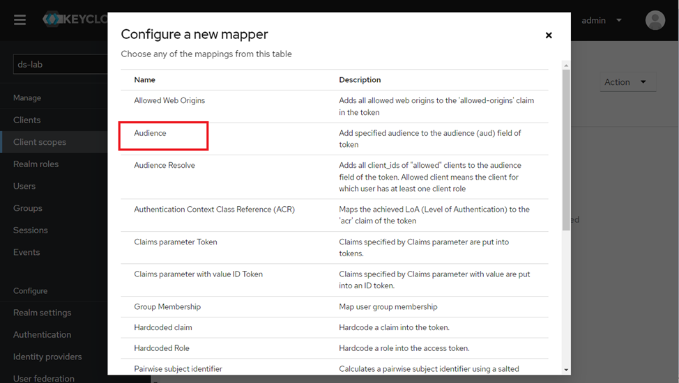 audприсутствуетds-lab, если же нет — проверить, что действия по созданиюclient scopesдля клиента ds-lab выполнены в полном объеме.