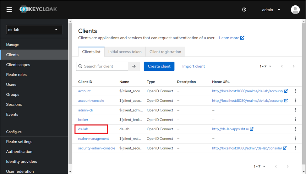 Конфигурирование DS Lab для работы с Realm Keycloak#