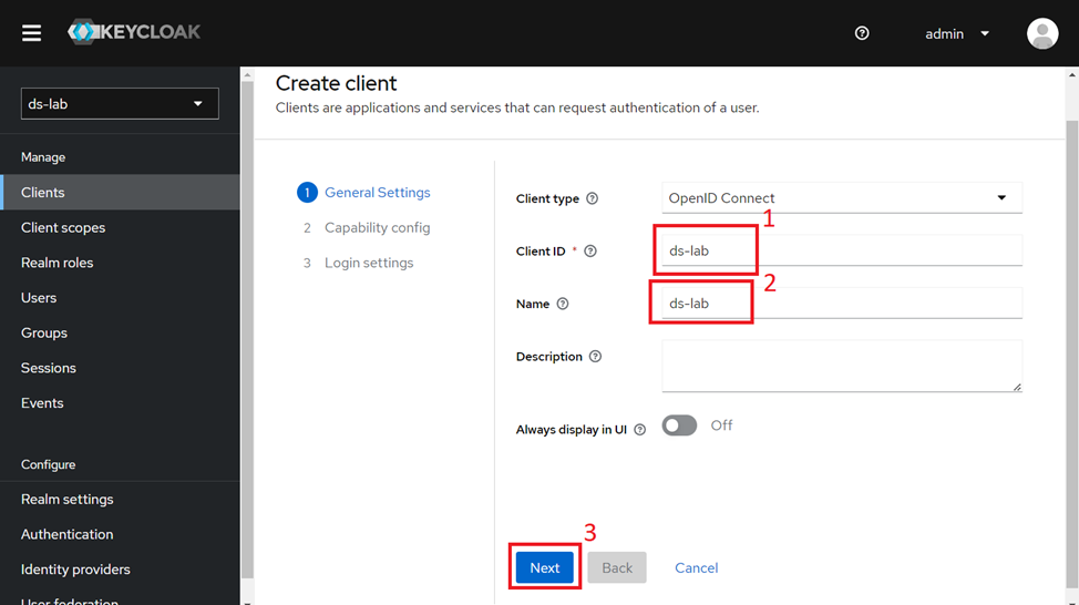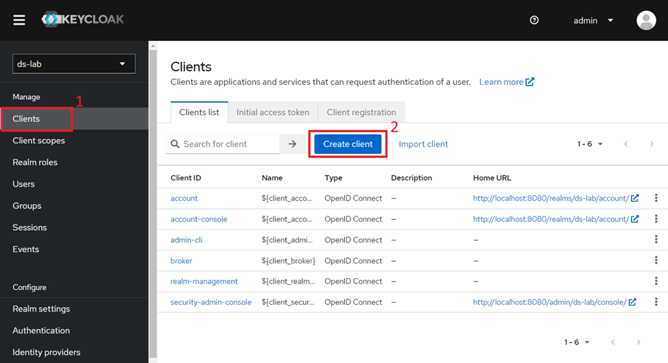 Для создания клиента, под которым DS Lab будет обращаться к Keycloak, необходимо: