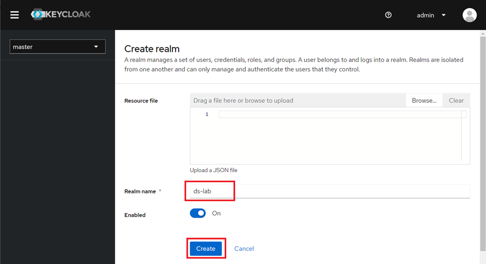 В открывшемся окне ввести наименование в поле Realm name (на рисунке это — "ds-lab") и нажать Create.