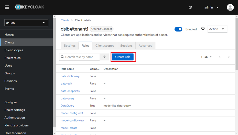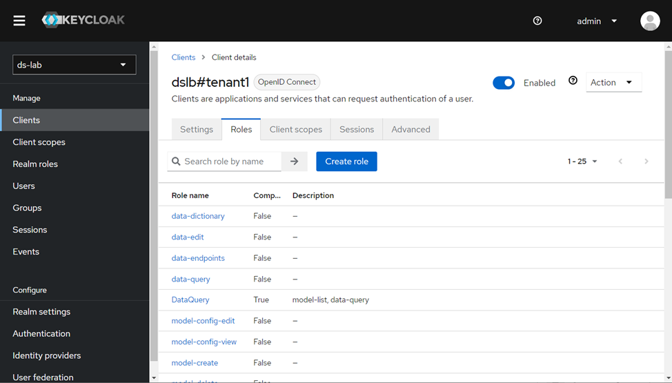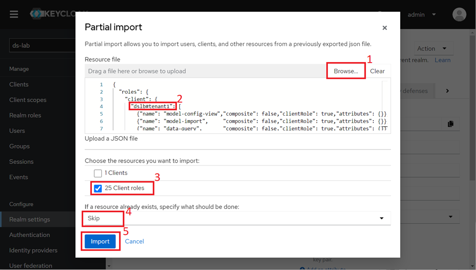 { "roles": { "client": { "dslb#tenant1": [ {"name": "model-config-view","composite": false,"clientRole": true,"attributes": {}}, {"name": "model-import", "composite": false,"clientRole": true,"attributes": {}}, {"name": "data-query", "composite": false,"clientRole": true,"attributes": {}}, {"name": "model-deploy", "composite": false,"clientRole": true,"attributes": {}}, {"name": "model-edit", "composite": false,"clientRole": true,"attributes": {}}, {"name": "data-endpoints", "composite": false,"clientRole": true,"attributes": {}}, {"name": "security-edit", "composite": false,"clientRole": true,"attributes": {}}, {"name": "data-dictionary", "composite": false,"clientRole": true,"attributes": {}}, {"name": "model-export", "composite": false,"clientRole": true,"attributes": {}}, {"name": "model-config-edit","composite": false,"clientRole": true,"attributes": {}}, {"name": "data-edit", "composite": false,"clientRole": true,"attributes": {}}, {"name": "model-create", "composite": false,"clientRole": true,"attributes": {}}, {"name": "model-delete", "composite": false,"clientRole": true,"attributes": {}}, {"name": "model-list", "composite": false,"clientRole": true,"attributes": {}}, {"name": "model-view", "composite": false,"clientRole": true,"attributes": {}}, {"name": "security-view", "composite": false,"clientRole": true,"attributes": {}}, { "name": "ModelAdmin", "description": "model-create, model-deploy, model-delete, model-config-view, model-config-edit, model-list", "composite": true,"composites": {"client": {"dslb#tenant1": ["model-list","model-create","model-config-view","model-config-edit","model-deploy","model-delete"]}}, "clientRole": true,"attributes": {} }, { "name": "ModelDeveloper", "description": "model-list, data-query, data-edit, data-endpoints, data-dictionary", "composite": true,"composites": {"client": {"dslb#tenant1": ["model-list","data-endpoints", "data-edit","data-query","data-dictionary"]}}, "clientRole": true,"attributes": {} }, { "name": "ModelSecurityViewer", "description": "security-view, model-list", "composite": true,"composites": {"client": {"dslb#tenant1": ["model-list","security-view"]}}, "clientRole": true,"attributes": {} }, { "name": "ModelSecurityEditor", "composite": true,"composites": {"client": {"dslb#tenant1": ["model-list","security-view","security-edit"]}}, "clientRole": true,"attributes": {} }, { "name": "TenantOperator", "description": "model-import, model-export, model-view, model-deploy, model-config-view, data-endpoints, model-list, data-dictionary", "composite": true,"composites": {"client": {"dslb#tenant1": ["model-list", "model-view", "model-config-view","model-import","data-endpoints", "model-deploy", "data-dictionary", "model-export"]}}, "clientRole": true,"attributes": {} }, { "name": "ModelViewer", "composite": true,"composites": {"client": {"dslb#tenant1": ["model-list","model-view"]}}, "clientRole": true,"attributes": {} }, { "name": "DataQuery", "description": "model-list, data-query", "composite": true,"composites": {"client": {"dslb#tenant1": ["model-list","data-query"]}}, "clientRole": true,"attributes": {} }, { "name": "ModelEditor", "composite": true,"composites": {"client": {"dslb#tenant1": ["model-list","model-view","model-edit","model-create","model-import"]}}, "clientRole": true,"attributes": {} }, { "name": "Tenant Admin", "composite": true,"composites": {"client": {"dslb#tenant1": []}}, "clientRole": true,"attributes": {} } ] } }, "clients": [ { "clientId": "dslb#tenant1", "enabled": true, "protocol": "openid-connect", "publicClient": true, "fullScopeAllowed": true, "standardFlowEnabled": true, "implicitFlowEnabled": false, "directAccessGrantsEnabled": false, "serviceAccountsEnabled": false } ] }Импортировать файл тенанта в realm. Для этого: