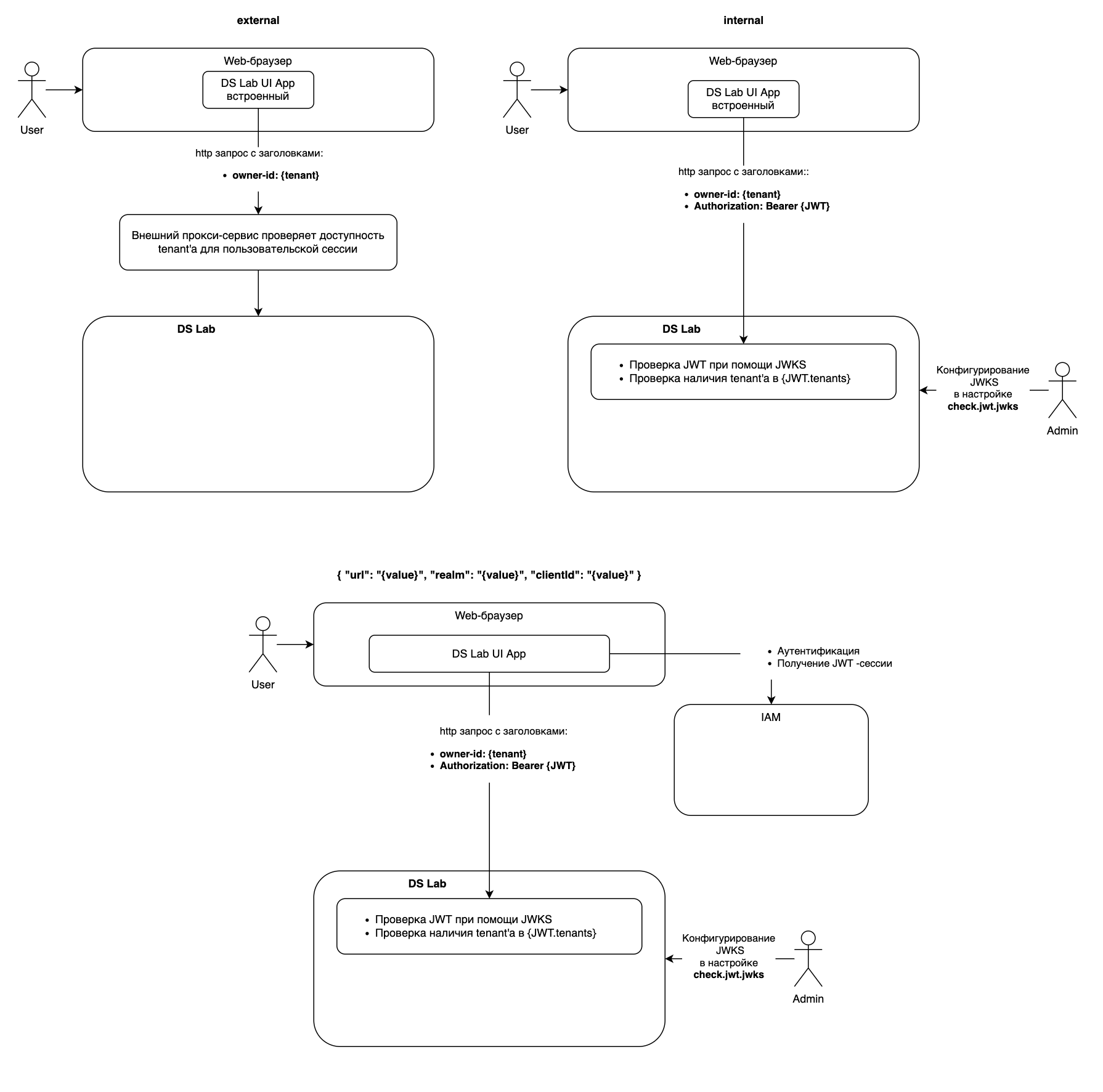 Внутри сервиса DS Lab. При таком способе поступающий HTTP-запрос в заголовке Authorization содержит Json Web Token (JWT), внутри которого в поле tenants содержится JSON-массив строковых значений (тенантов), оперировать которыми разрешено в рамках данной JWT-сессии. В таком случае DS Lab осуществит последовательно проверки: