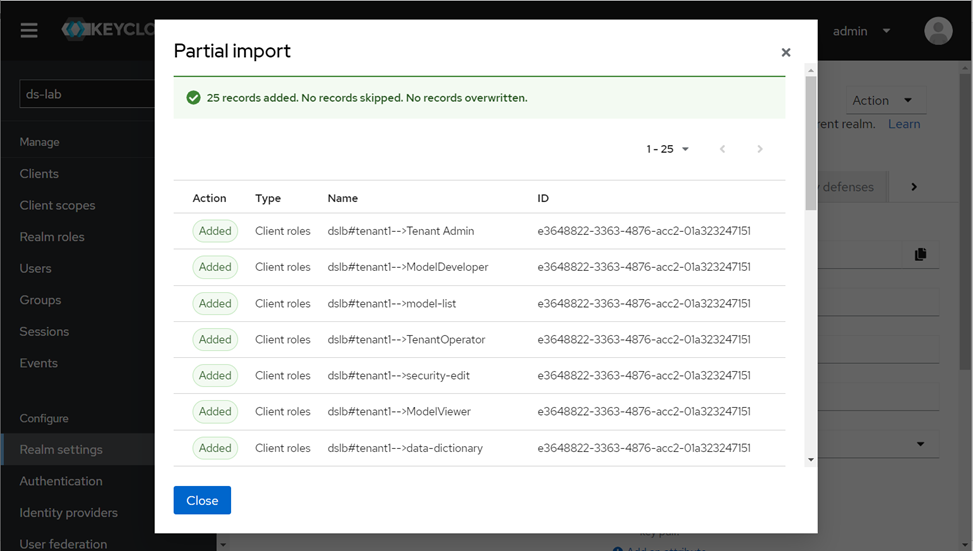 Перейти на страницу соответствующего клиента-тенанта во вкладку Roles и убедиться, что привилегии и базовые роли успешно импортировались.