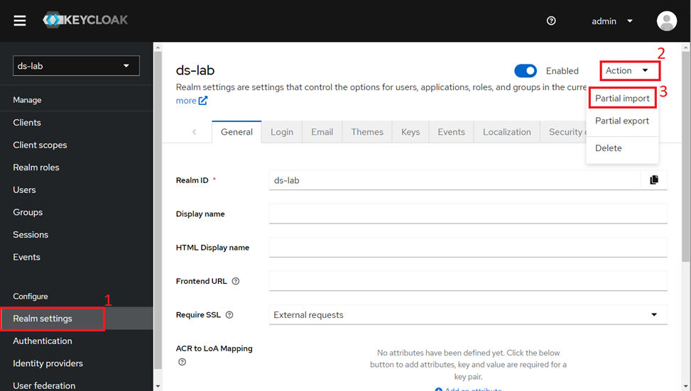 Перейти на страницу Realm settings, раскрыть меню Action и выбрать Partial import.