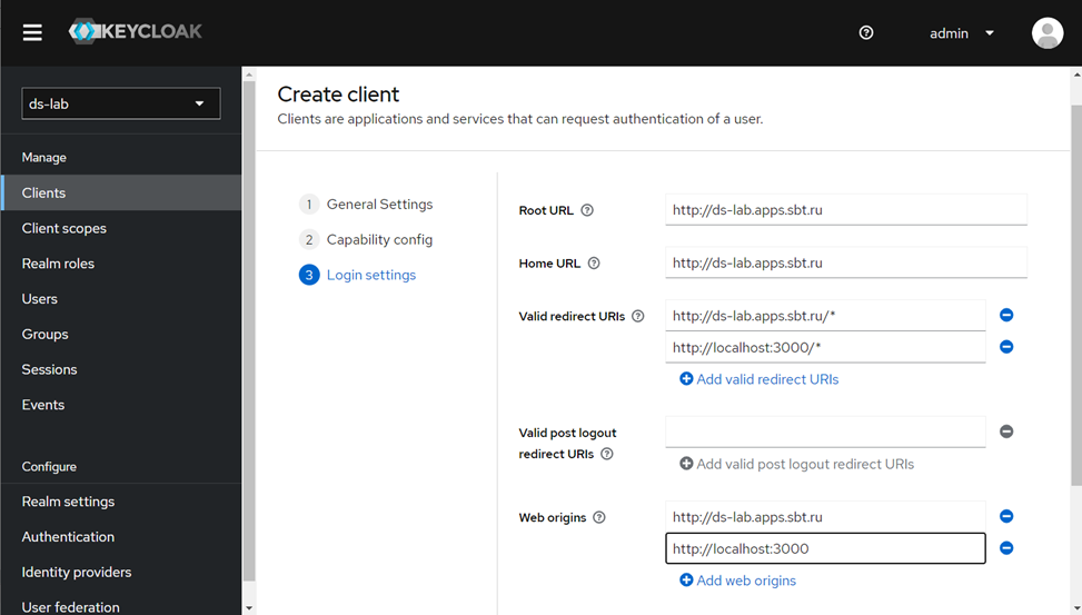 На следующей странице в полях Valid Redirect URIs и Web Origins прописать адрес сервиса DS Lab. Проверить, что пункт Standard flow* выбран.