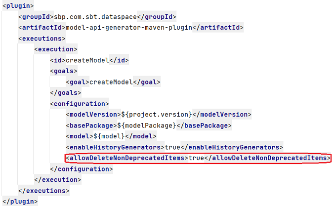 isDeprecated=trueэлементы будут готовы к физическому удалению — поднять мажорную версию модели и выпустить модель с установленным параметром <dropRemovedItems>true</dropRemovedItems> плагина генерации модели (см. раздел Механизм удаления неиспользуемых элементов в два этапа).переключиться на механизм удаления неиспользуемых элементов в три этапа (см. раздел Механизм удаления неиспользуемых элементов в 3 этапа), добавив в конфигурацию maven-плагина генерации модели (model-api-generator-maven-plugin) параметра