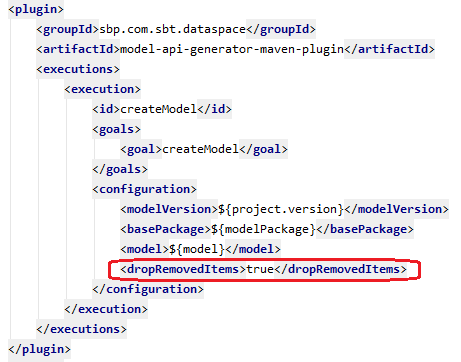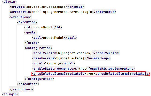 Изменения для физического удаления формируются только при добавлении параметра dropRemovedItems со значением true (<dropRemovedItems>true</dropRemovedItems>) в конфигурацию плагина генерации модели model-api-generator-maven-plugin (см. рисунок ниже).