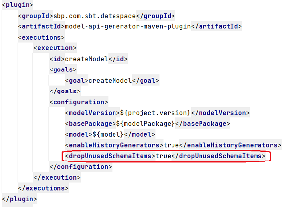переключиться на механизм удаления неиспользуемых элементов в два этапа (см. раздел "Механизм удаления неиспользуемых элементов в два этапа"), добавив в конфигурацию maven-плагина генерации модели (model-api-generator-maven-plugin) параметра