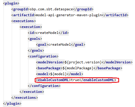 Добавление операций, включающих изменения данных, которые отражены в тегах insert, update, delete и в sql, требуют установки параметра enableCustomDML со значением true (<enableCustomDML>true</enableCustomDML>) в конфигурацию плагина генерации модели model-api-generator-maven-plugin (см. рисунок ниже).