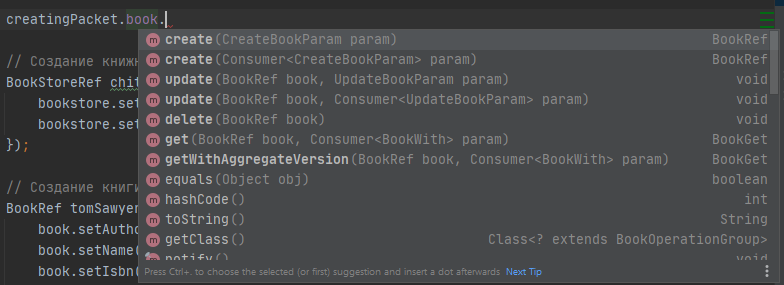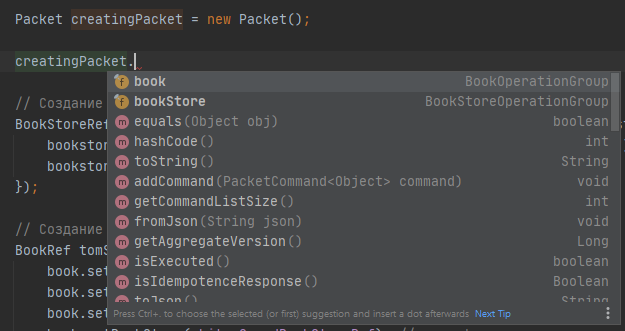 На основе пакета, указанного в параметре basePackage, сгенерировался пакет packet с классом Packet. Этот пакет следует использовать для формирования пакета CRUD-команд.