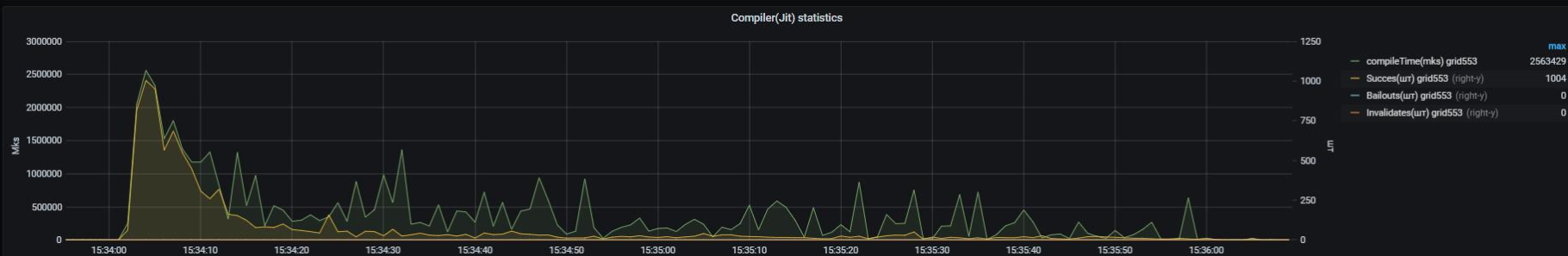 compilerTime — время, затраченное на компиляцию; Succes — количество успешных компиляций; Bailouts, Invalidates — количество различных событий декомпиляции (после прогрева JVM должны быть равны "0") |