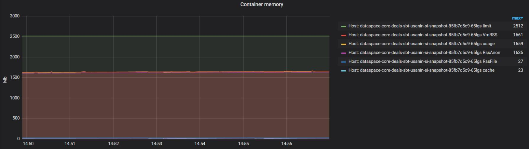 dataspace.healthcheck.safepointtime.enable=true включен(true)/отключен(false) сбор статистики dataspace.healthcheck.safepointtime.threshold=2000000 пороговое значение в микросекундах для перевода индикатора в DOWN dataspace.healthcheck.safepointtime.expireseconds=30 длительность хранения метрики, на основе которого рассчитывается 95 перцентильvmRssUsage — компонент, отображающий потребление памяти только процессом JVM (JVM Heap + Non-Heap).