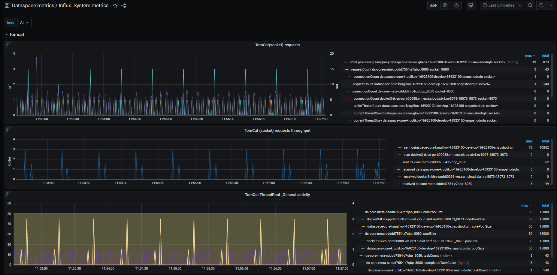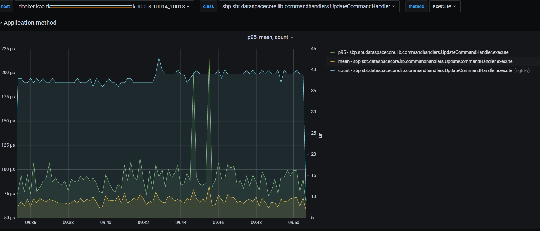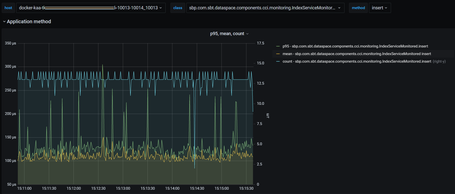 Применяется Push-модель. Сервис DataSpace сам отправляет метрики в InfluxDB (см. раздел "Системное программное обеспечение" документа "Руководство по установке"), группируя их в пакеты. При этом частота сбора регулируется самим сервисом DataSpace и составляет 1 сек. Timestamp метрики проставляется в момент ее формирования. Интервал выбран путем поиска компромисса между подробностью, тяжестью и SLA изучаемых во время нагрузочного тестирования.