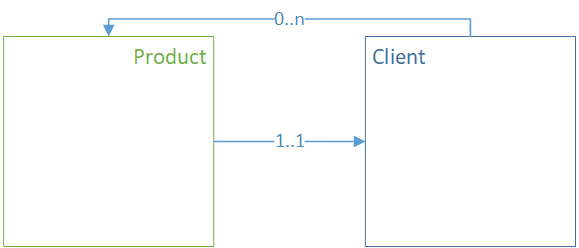 Сущность 1 может иметь связь с неограниченным числом Сущностей 2, например, в случае связи Product: Client (1 — *).
