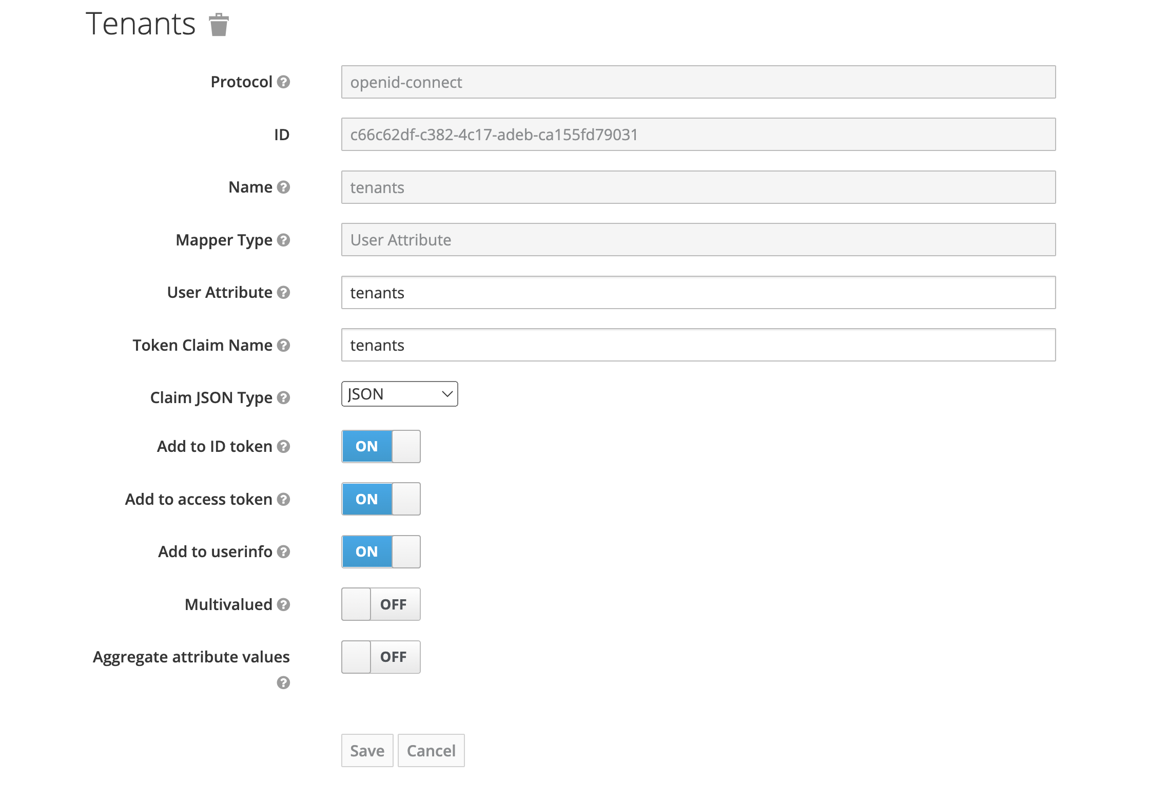 Для пользователей (users) IAM Keycloak необходимо на вкладке Attributes завести атрибут tenants, представляющий собой JSON-массив строковых значений тех тенантов, модели DS Lab которых должны быть доступны пользователю: