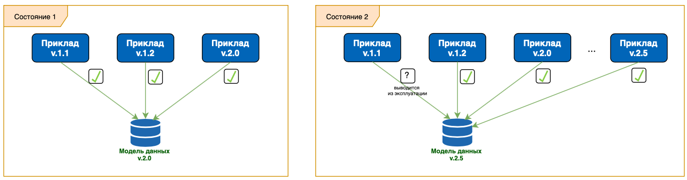 Основной принцип — это поддержка обратной совместимости в решениях, когда обновление модели данных не влияет на работоспособность приложения, находящегося в эксплуатации.