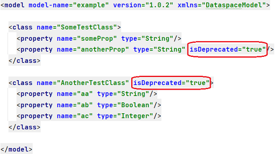 Пользователь помечает элементы модели (классы и свойства классов) в описании модели (model.xml) как устаревшие, проставляя на них явно атрибут