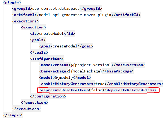 isDeprecated=trueэлементы будут готовы к физическому удалению — поднять мажорную версию модели и выпустить модель с установленным параметром <dropRemovedItems>true</dropRemovedItems> плагина генерации модели (см. раздел Механизм удаления неиспользуемых элементов в два этапа).переключиться на механизм удаления неиспользуемых элементов в три этапа (см. раздел Механизм удаления неиспользуемых элементов в 3 этапа), добавив в конфигурацию maven-плагина генерации модели (model-api-generator-maven-plugin) параметра
