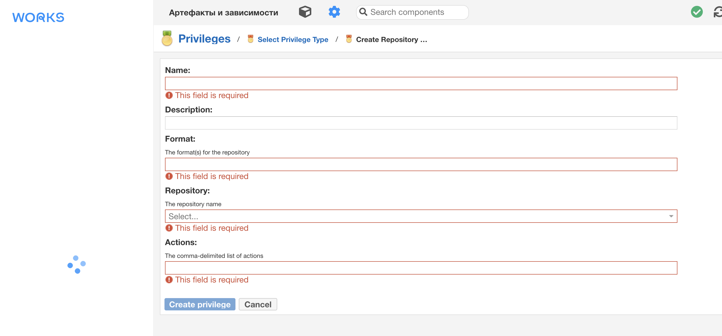 Чтобы создать новую привилегию, нажмите кнопку «Create privilege» на панели «Privileges» и выберите «Repository View». При создании привилегии будет загружена форма «Create Repository View Privilege». Эта форма принимает имя привилегии (Name), описание привилегии (Description), формат целевого репозитория (Format), имя целевого репозитория (Repository) и действия (Actions).