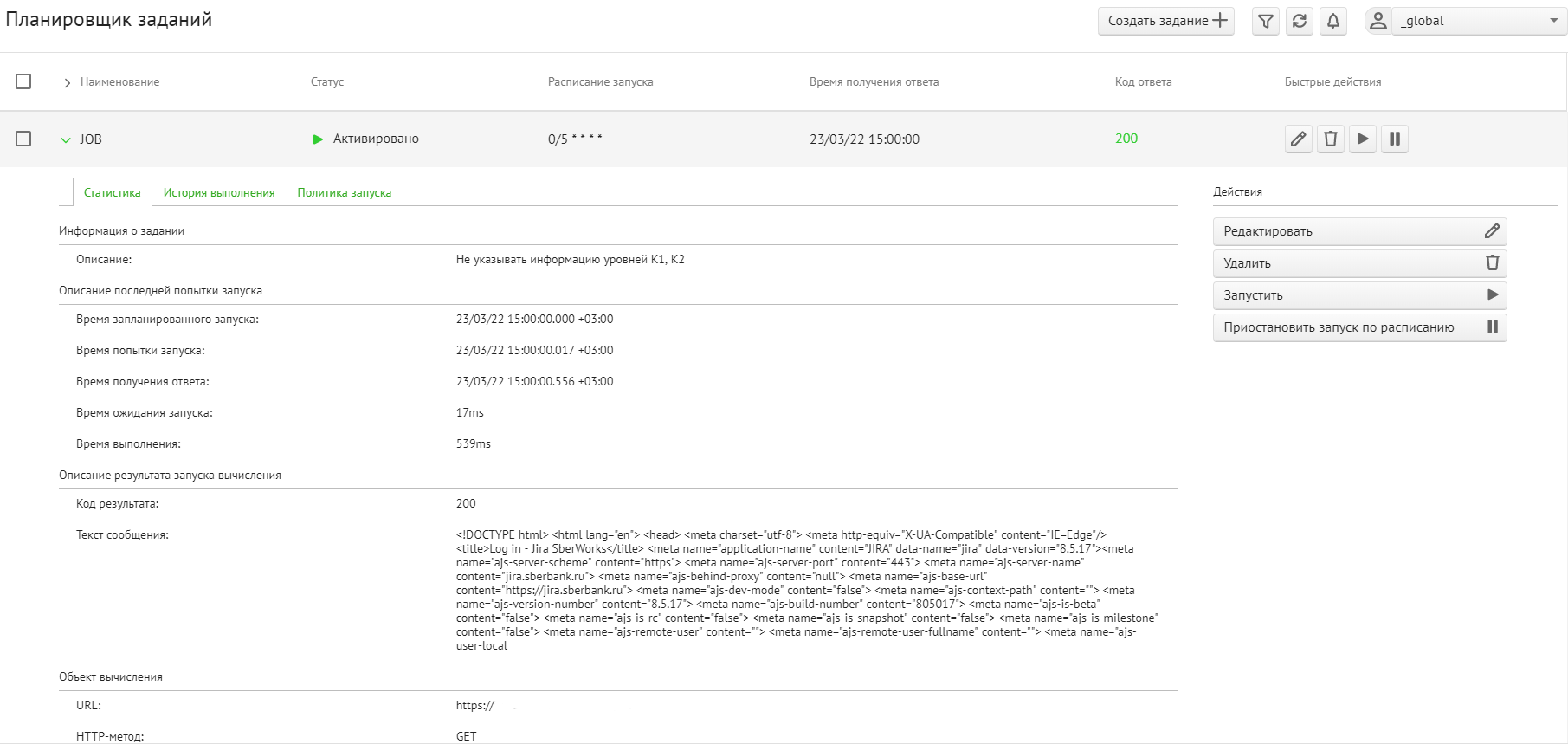 Описание Задания, время запланированного запуска, попытки запуска и получения ответа.