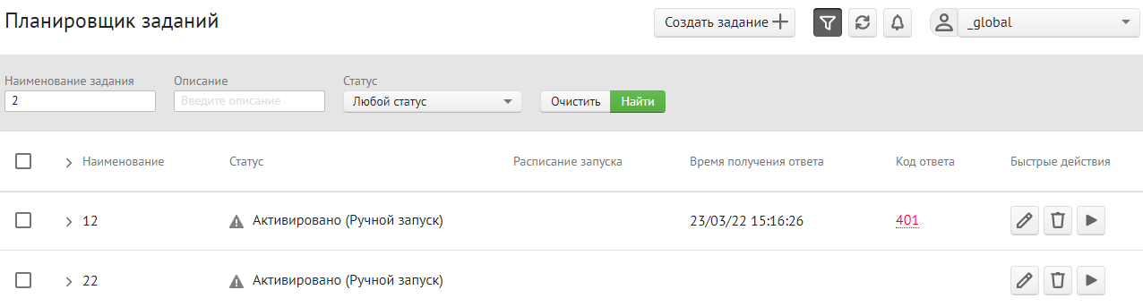 На странице Планировщика Заданий пользователю доступна основная информация о Задании и кнопки быстрых действий с Заданием.