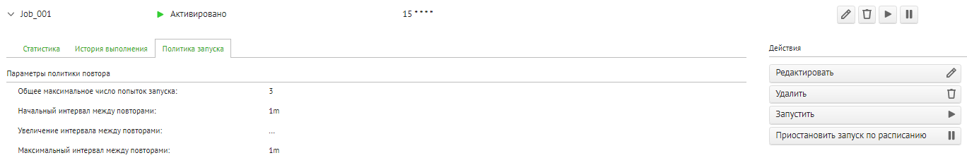 Пользователю предоставляется возможность настроить параметры, чтобы Задание следовало этим настройкам при возникновении ошибок при запуске и/или выполнении, а также отслеживать основные параметры повтора Задания и актуальные параметры состояния повтора экземпляра Задания.