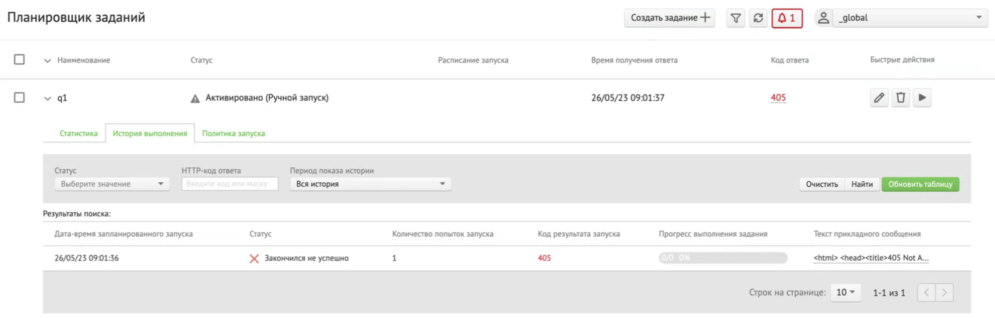 В случае неуспешного запуска Задания выводится сообщение с ошибкой (подробнее о возможных ошибках в разделе «Часто встречающиеся проблемы и пути их устранения»).