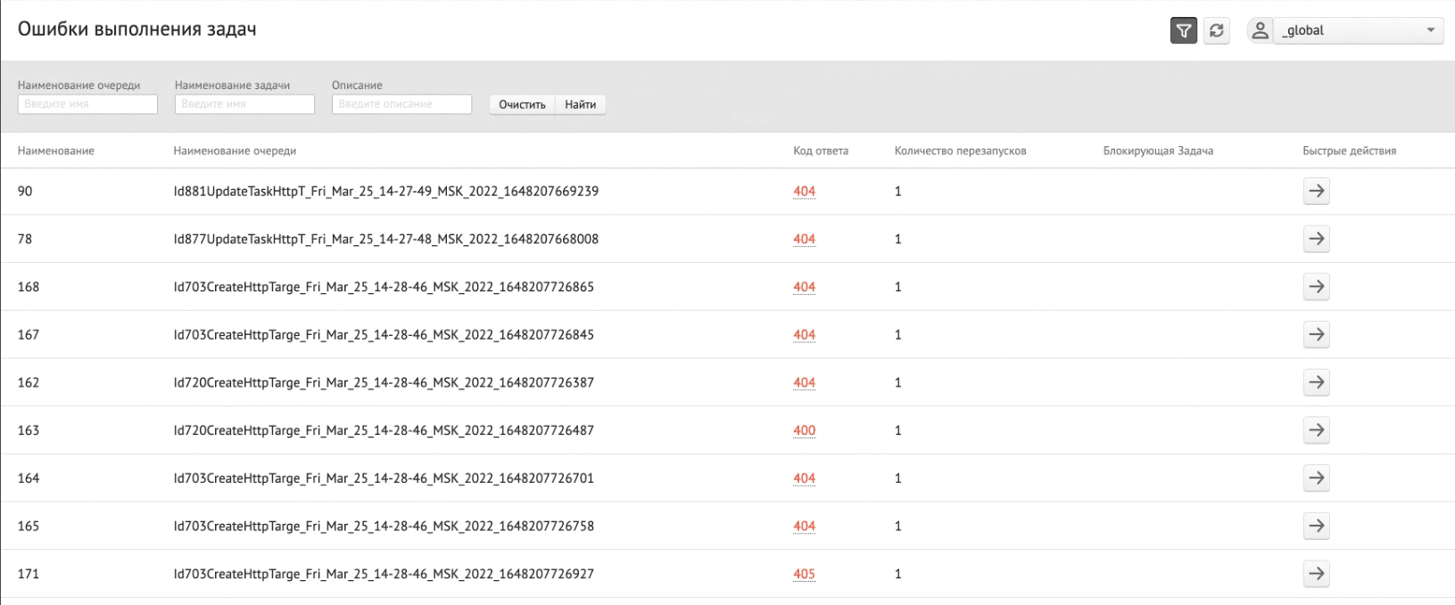 Для получения списка Задач, выполненных с ошибкой, пользователь может перейти на страницу Ошибки выполнения задач (Task execution errors), нажав кнопку