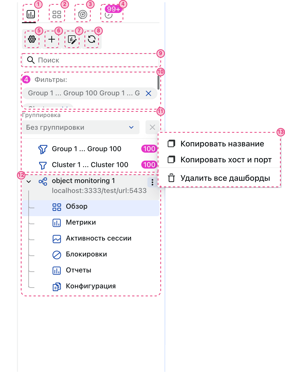 Содержит список подключенных объектов мониторинга с перечнем дашбордов |