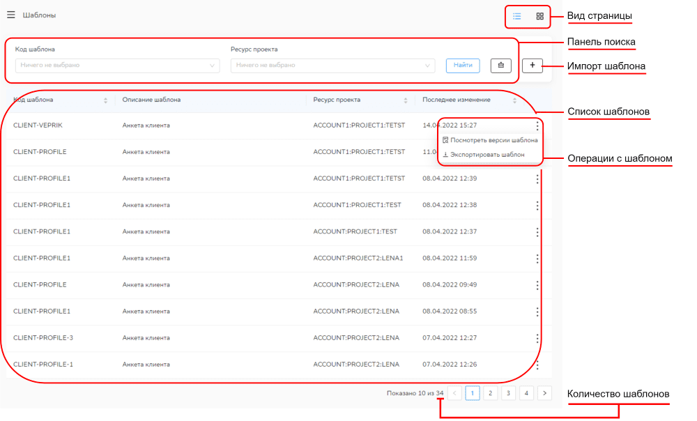 Список — при нажатии на иконку записи на странице отображаются в виде таблицы со столбцами: Код шаблона, Описание шаблона, Ресурс проекта, Последнее изменение, Операции (смотрите риунок выше) |