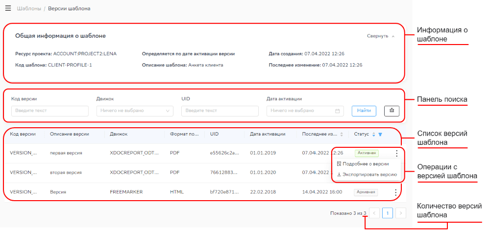 Версии шаблона — страница предназначена для просмотра информации о шаблоне и его версиях (смотрите раздел «Версии шаблона»).