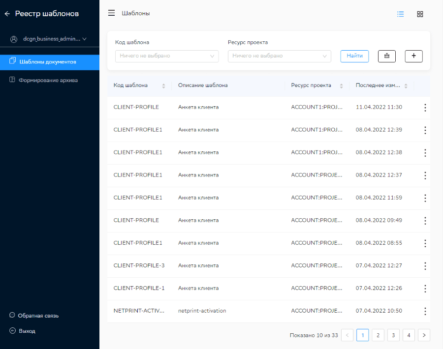 Создатель архивов шаблонов (роль DCGN_TEMPLATE_CREATOR) — пользователь имеет права на формирование ZIP-архива шаблона через приложение, а также на просмотр шаблонов, экспорт шаблона определенного ресурса проекта или группы ресурсов проектов.