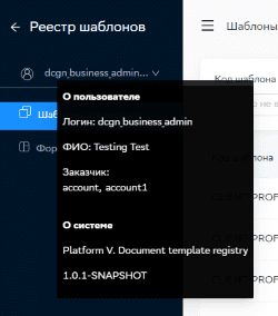 Панель с информацией о пользователе и системе — на панели отображается логин и ФИО пользователя. При наведении курсора мыши на иконку ˅ отображается следующая информация: