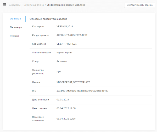 Информация о версии шаблона — страница предназначена для просмотра информации о версии шаблона, ее параметрах и ресурсах по умолчанию (смотрите раздел «Информация о версии шаблона»).