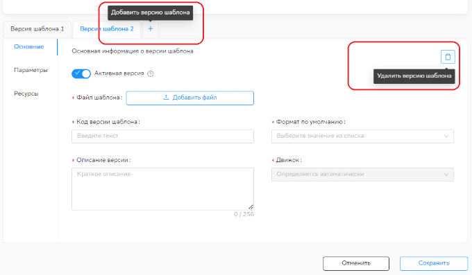 Описание версии — поле для ввода описания версии шаблона, указывается в свободной форме (длина строки до 256 символов). Обязательное для заполнения поле.