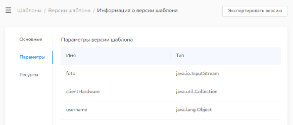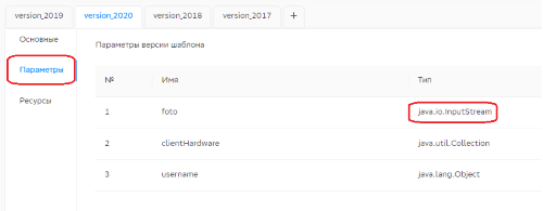 Внимание! Ресурс может быть добавлен только для параметра с типом java.io.InputStream. Посмотреть тип параметра можно на вкладке «Параметры»:
