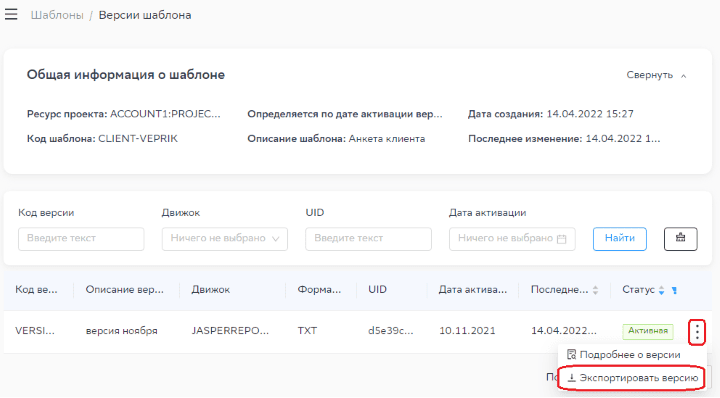 Версии шаблонов могут быть экспортированы, в формате ZIP, только в статусе «Активная». Операция доступна на страницах «Версии шаблона» и «Информация о версии шаблона».