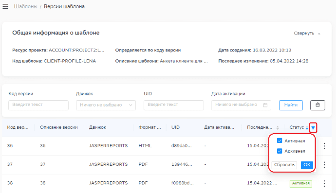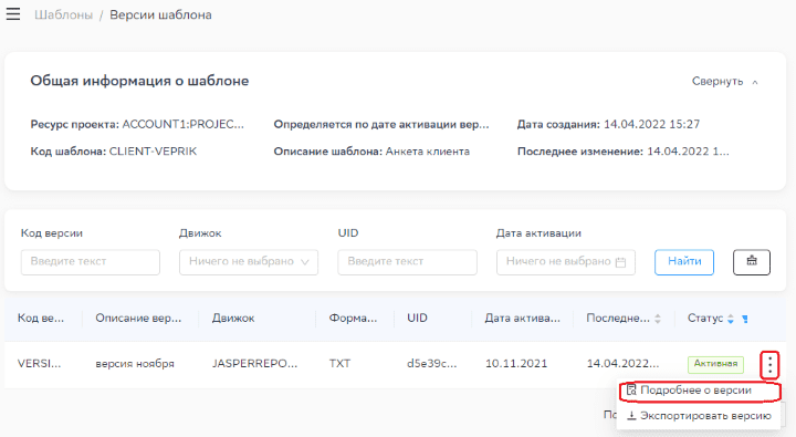 Просмотр детальной информации о шаблоне и версиях шаблона |