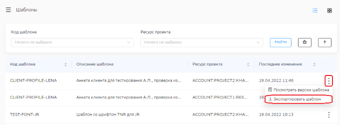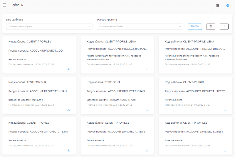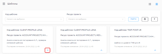 Сетка — при нажатии на иконку записи на странице отображаются в виде карточек, на каждой карточке содержатся поля с информацией о шаблоне (Код шаблона, Ресурс проекта, Описание шаблона, Последнее изменение) и иконка «Экспортировать шаблон» (смотрите рисунок ниже) |