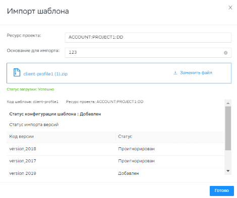 Внимание. После импорта архивной версии в систему деактивированную версию шаблона перевести в активное состояние будет нельзя. По архивной версии можно будет посмотреть только параметры версии на странице «Шаблоны»/«Версии шаблона»/«Информация о версии шаблона». Для восстановления потребуется создать новую активную версию.