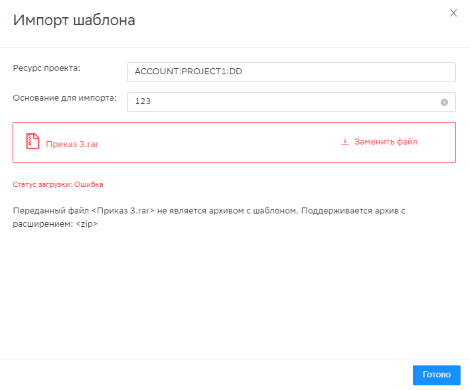 импортировать ZIP-архив шаблона документа (доступно только для пользователя с ролью «Бизнес-администратор»);